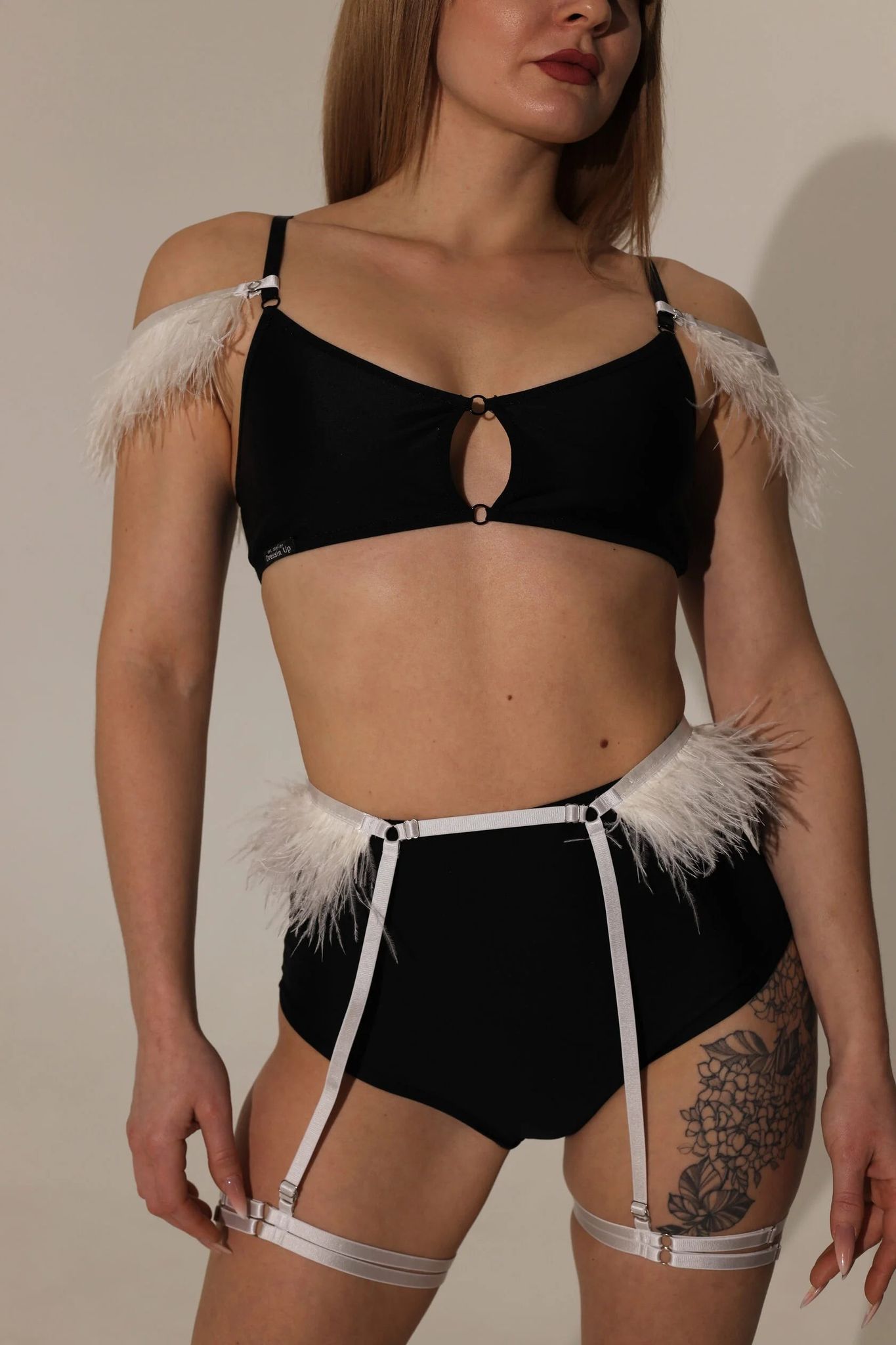 The CHARM set consists of two units (top and shorts) and removable garters with feathers. Top with a cutout between the chest, nickel furniture, adjustable straps. There is a removable foam cup. Shorts with a high thigh line, which visually lengthens the legs. Garters are adjustable.