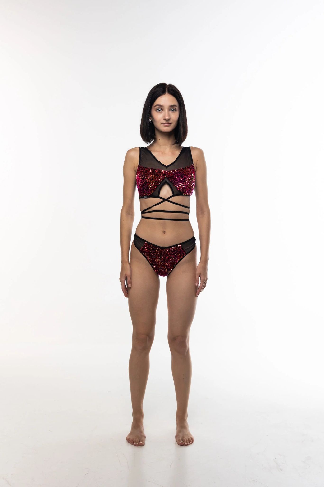 The Illusion set consists of two units (top and shorts). Top with a cutout under the chest, nickel furniture, adjustable straps. There is a removable foam cup. Shorts in a classic shape. Garters are adjustable.