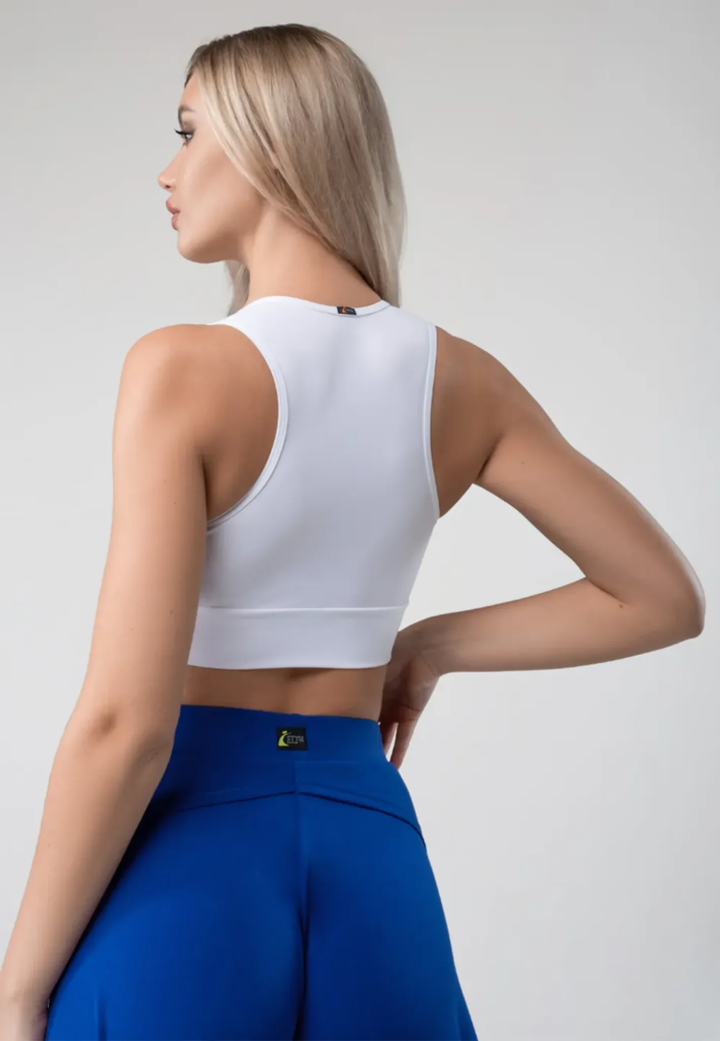 An elegant, thick sports bralette top with reliable bust support. The Tulip top is like the little black dress in the world of sports tops - a must have for every girl who is used to looking feminine and stylish while working out. The V-neckline perfectly emphasizes the décolleté area, removable cups with darts provide light push-up, wide straps comfortably and securely hold the top in place. Perfect as a top for a swimsuit and beach summer looks.