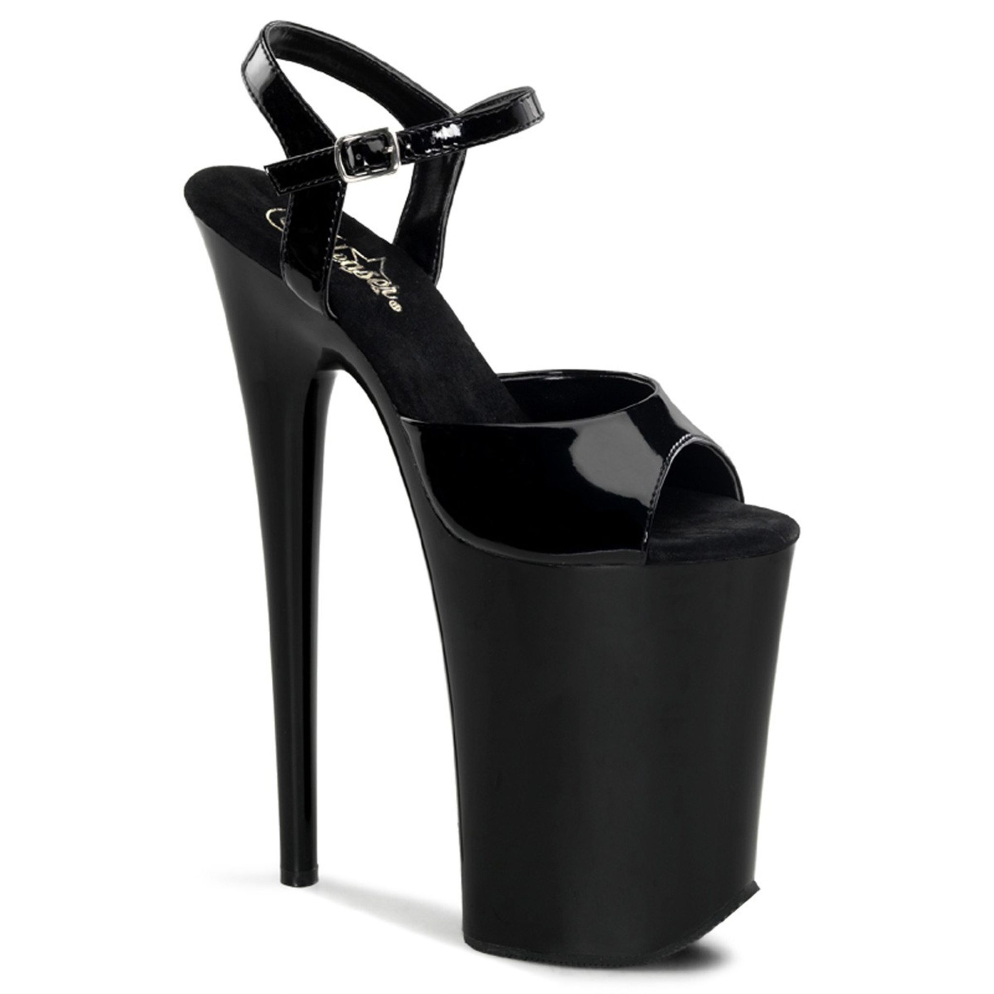 9" (229mm) Heel, 5 1/4" (133mm) Platform Ankle Strap Sandal. **WARNING: Extreme High Heel. Not Recommended for Walking or Dancing.