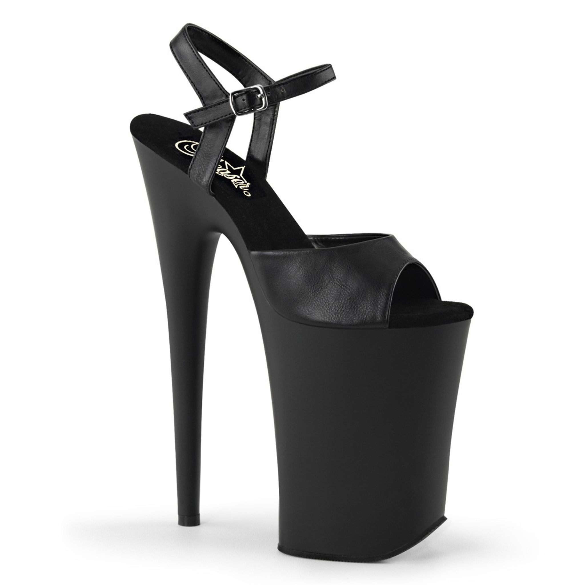 9" (229mm) Heel, 5 1/4" (133mm) Platform Ankle Strap Sandal. **WARNING: Extreme High Heel. Not Recommended for Walking or Dancing.