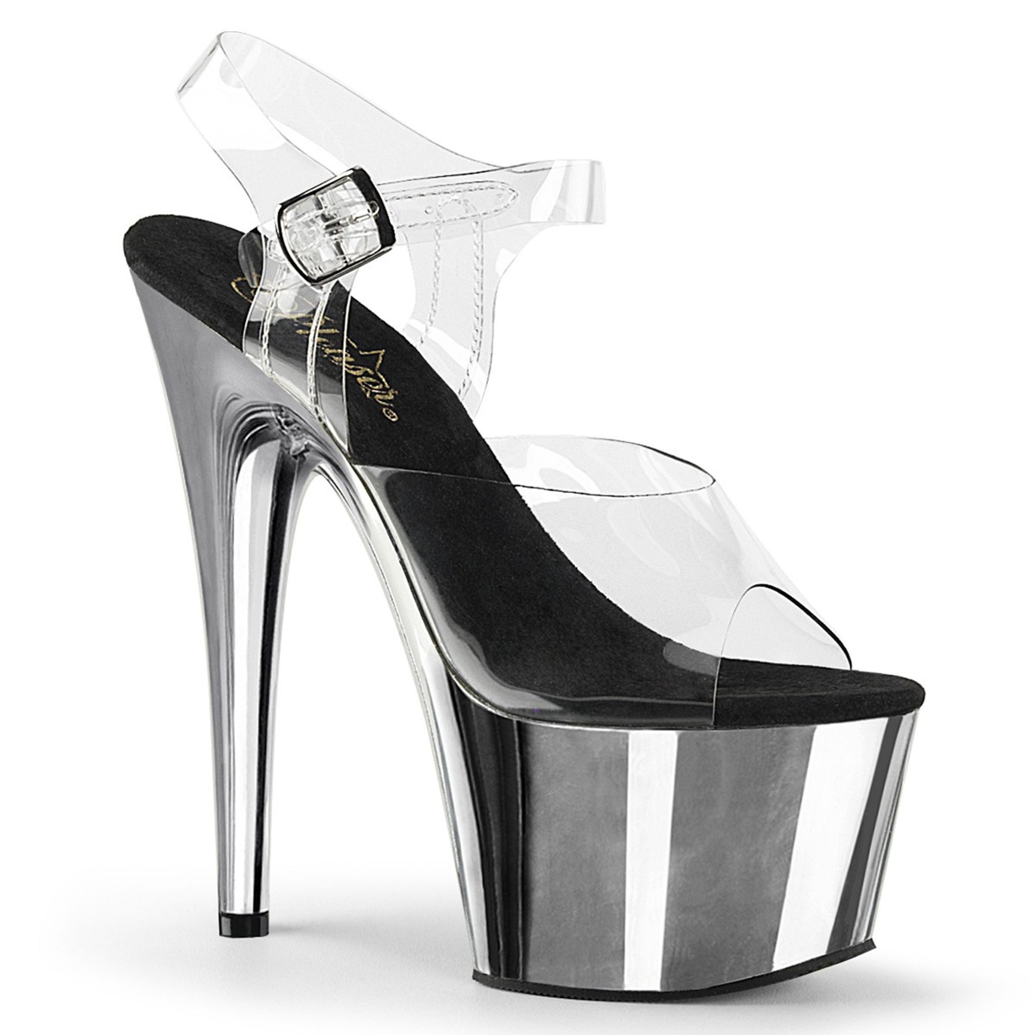 7" (17.8cm) Stiletto Heel, 2 3/4" (7cm) Platform Ankle Strap Sandal with Chrome Plated Bottom