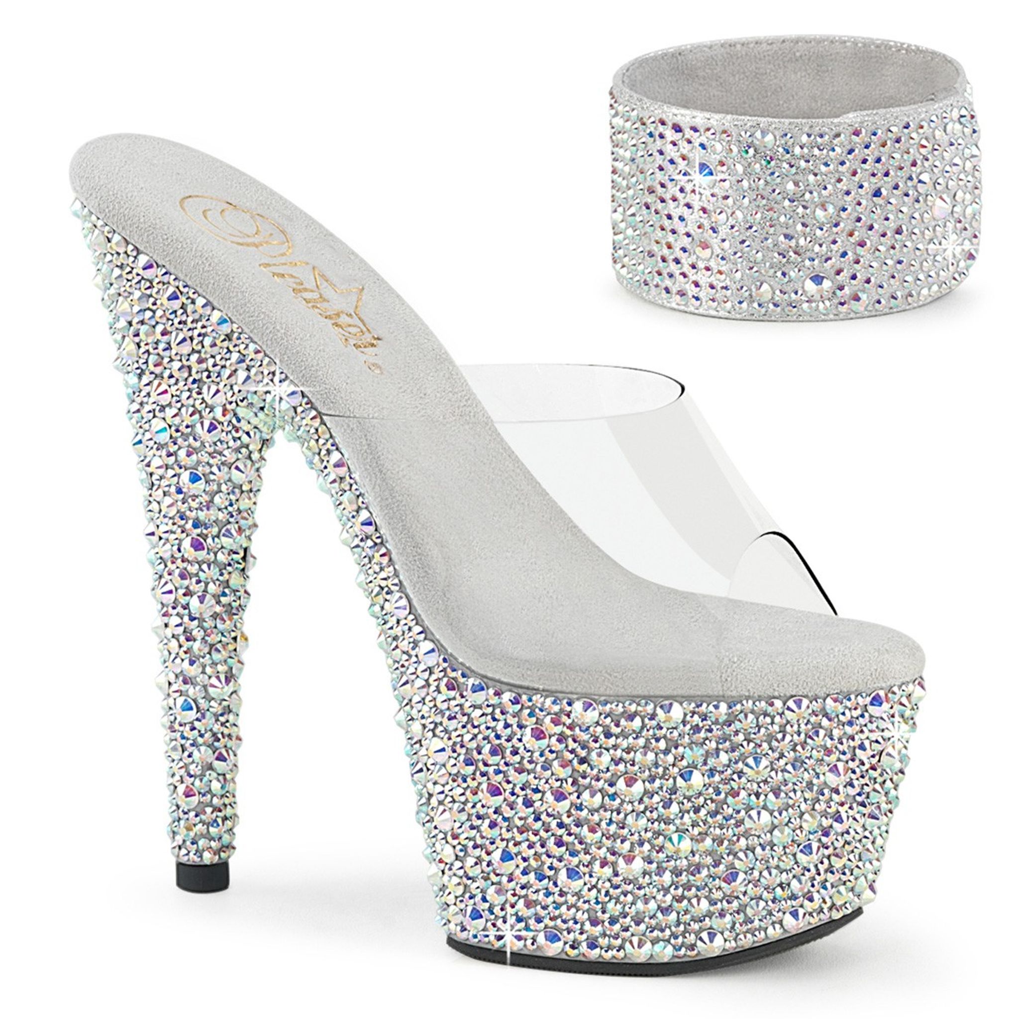 7" (178mm) Heel, 2 3/4" (70mm) Platform Slide Featuring Multi Sized Rhinestones Encrusted on the Entire Platform Bottom. Includes a Pair of 1 3/4" (45mm) Matching Adjustable Ankle Cuffs