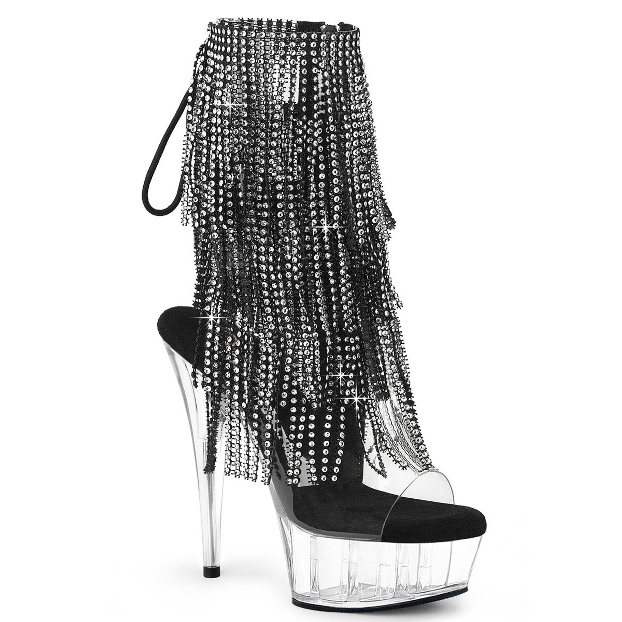 6" (152mm) Heel, 1 3/4" (45mm) Platform Open Toe/Heel Rear Lace-Up Ankle Boot Featuring 4-Layer Chrome Plated, Simulated Rhinestone Fringe, Inner Side Zip Closure