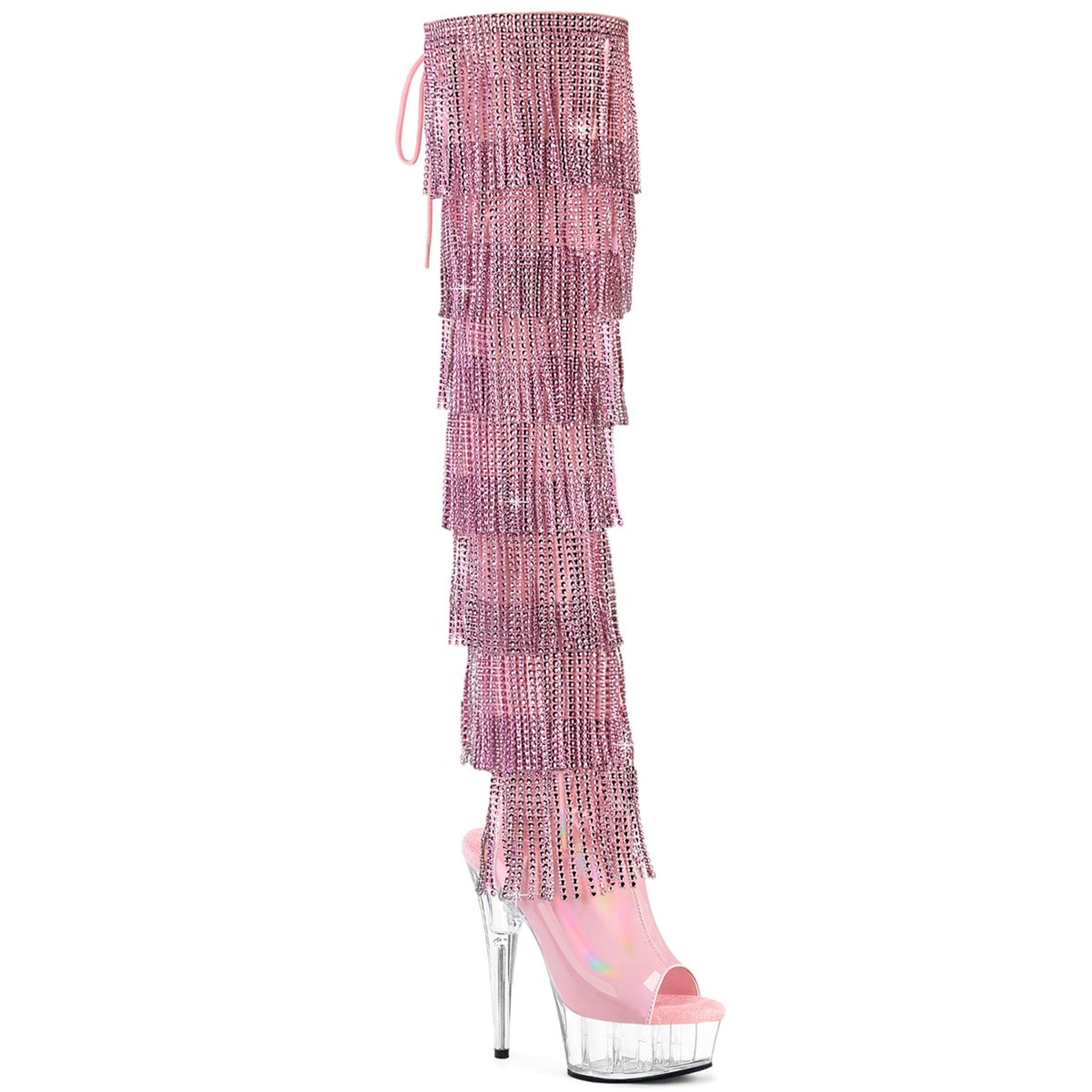 6" (152mm) Heel, 1 3/4" (45mm) Platform Open Heel/Toe Lace-Up Back Thigh High Boot Featuring 7-Layer Simulated Rhinestone Fringes, Full Length Inner Side Zip Closure