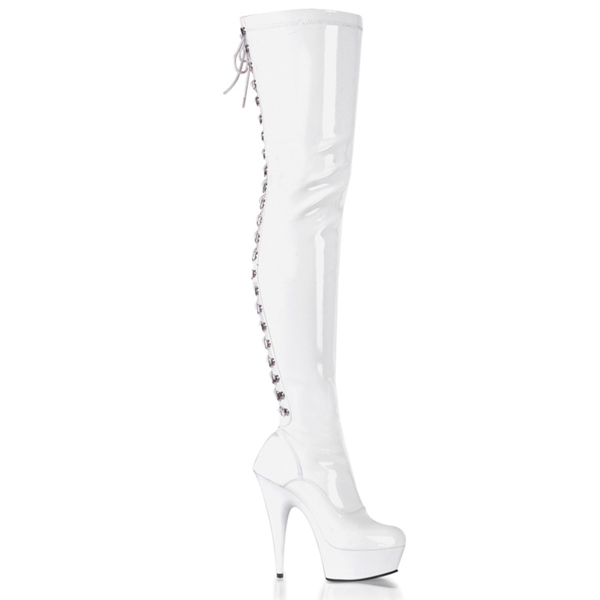6" (152mm) Heel, 1 3/4" (45mm) Platform D-Ring Lace-Up Back Stretch Thigh High Boot, Full-Length Inner Side Zip Closure
