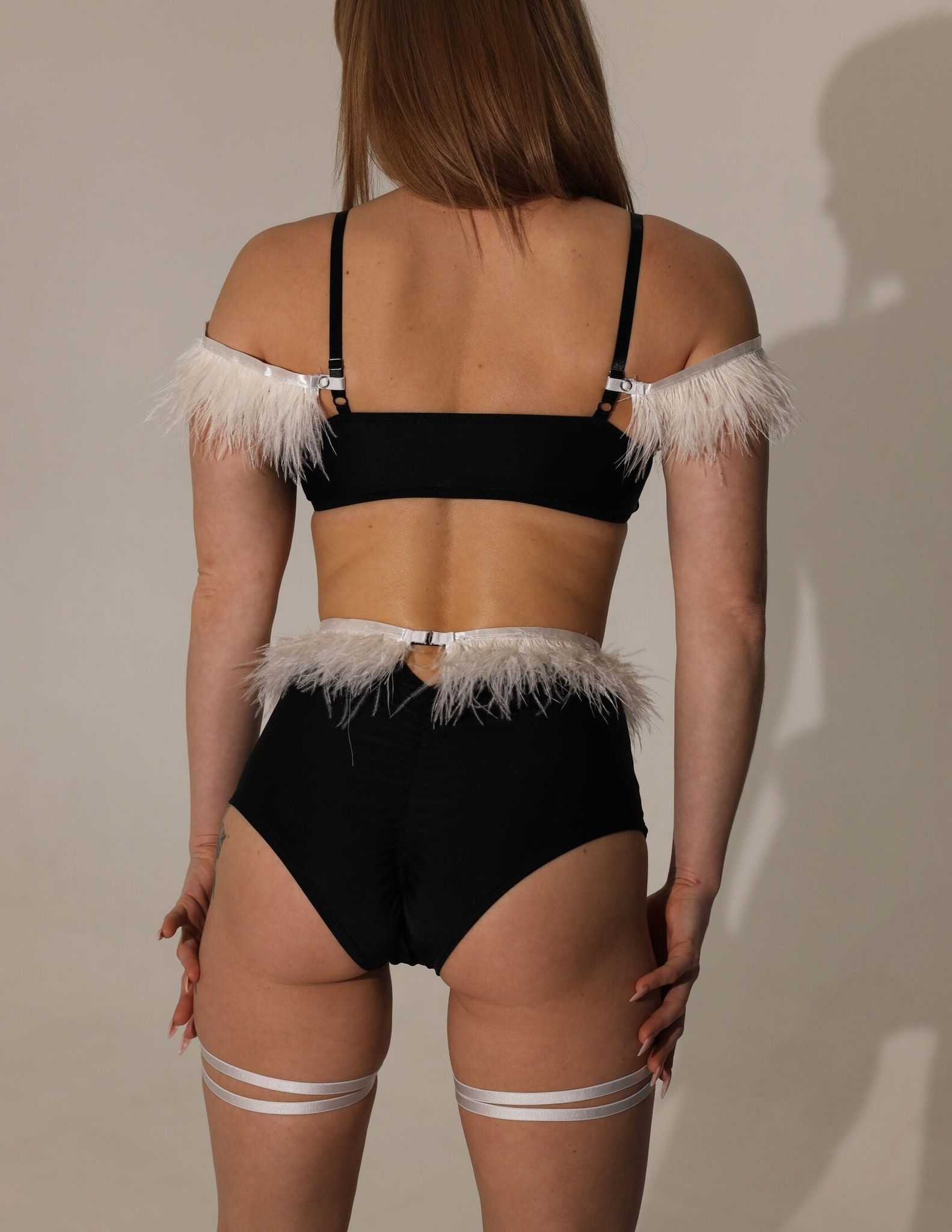 The CHARM set consists of two units (top and shorts) and removable garters with feathers. Top with a cutout between the chest, nickel furniture, adjustable straps. There is a removable foam cup. Shorts with a high thigh line, which visually lengthens the legs. Garters are adjustable.