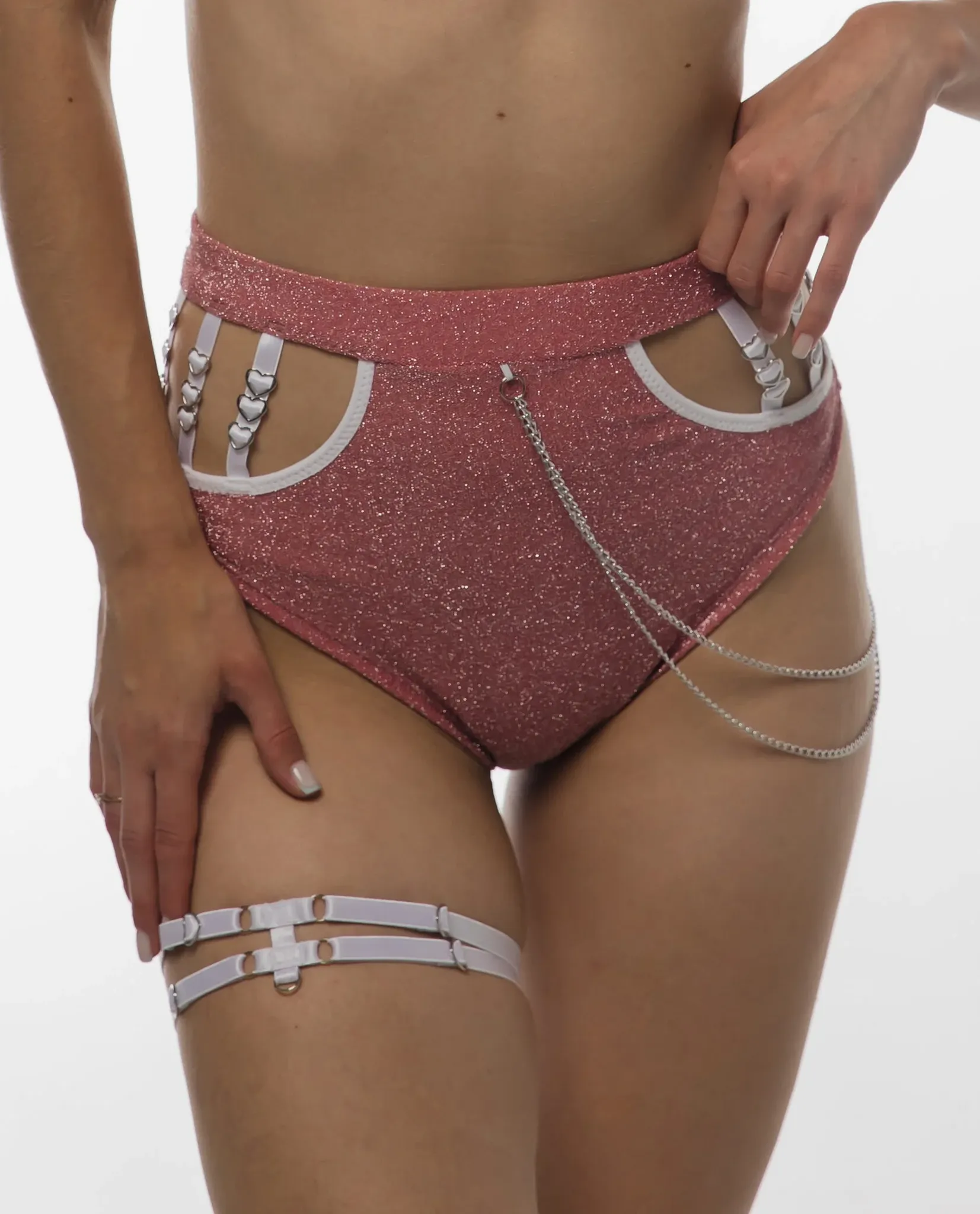 High-waisted shorts with side cutouts, ruched back, and one-side chain detail. Nickel hardware with rings and hearts. Without the garter (it can be found in the accessories section).