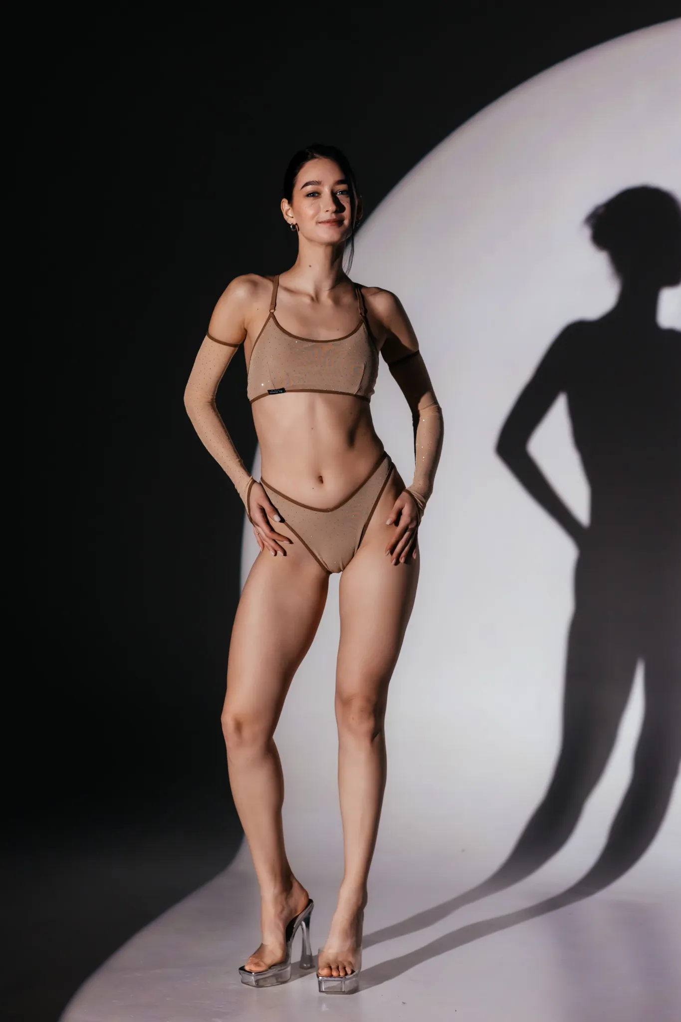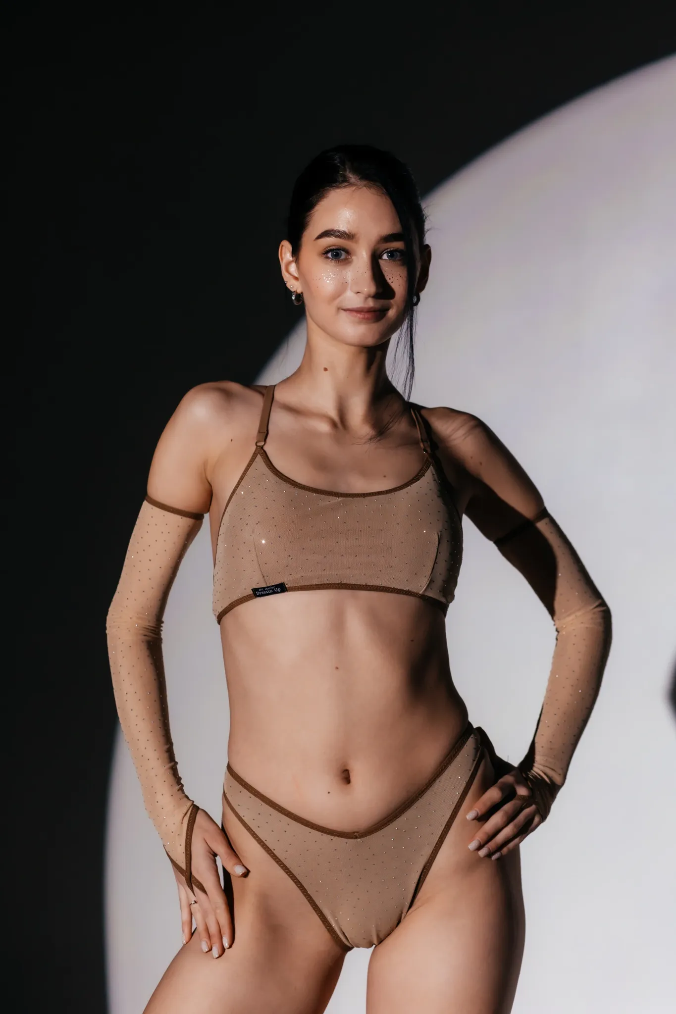 Effortless, sensual, and hypnotic — the SKINELLE сrystal mesh set is created to highlight movement, elegance, and feminine power. The delicate crystal mesh beautifully hugs the body while revealing just enough to stay confident on stage and during training. The soft shimmering stones catch the spotlight with every motion, making the silhouette look sculpted and ethereal. The top includes removable padded cups, allowing you to choose between a natural soft silhouette or additional support and shape — perfect for both training and performances. Lightweight, stretchy and breathable, this set allows full freedom of movement — ideal for exotic dance, pole, high heels, or stage shows.