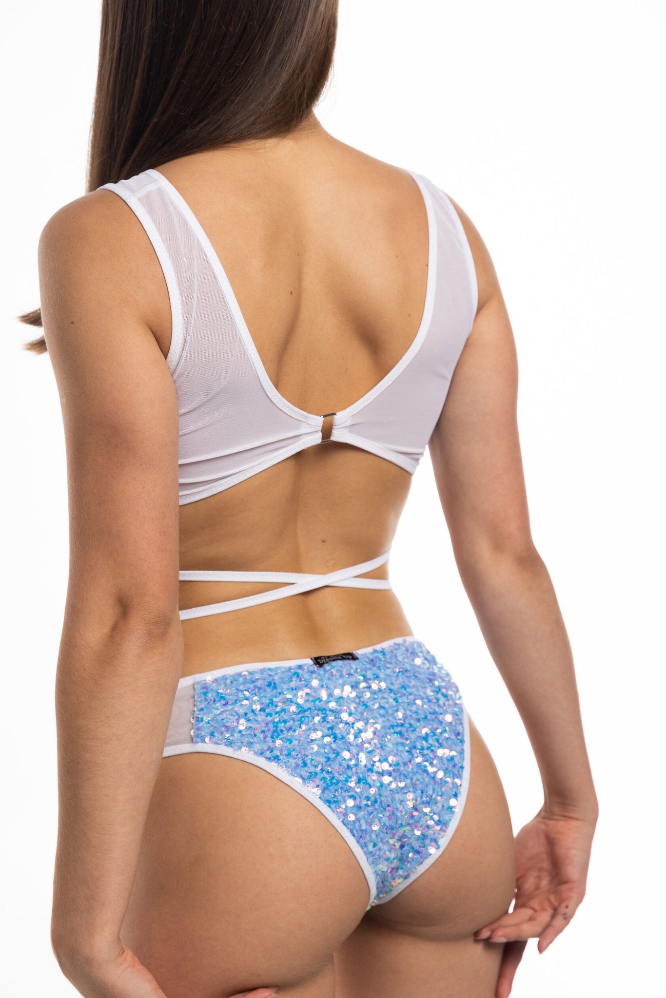 The Illusion set consists of two units (top and shorts). Top with a cutout under the chest, nickel furniture, adjustable straps. There is a removable foam cup. Shorts in a classic shape. Garters are adjustable.