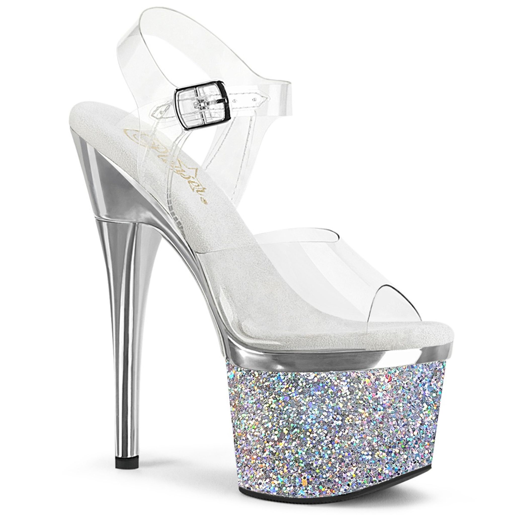 7" (178mm) Heel, 3" (76mm) Platform Ankle Strap Sandal w/Chrome Plated Upper Platform and Heel Featuring Holographic Glitters Covering the Platform
