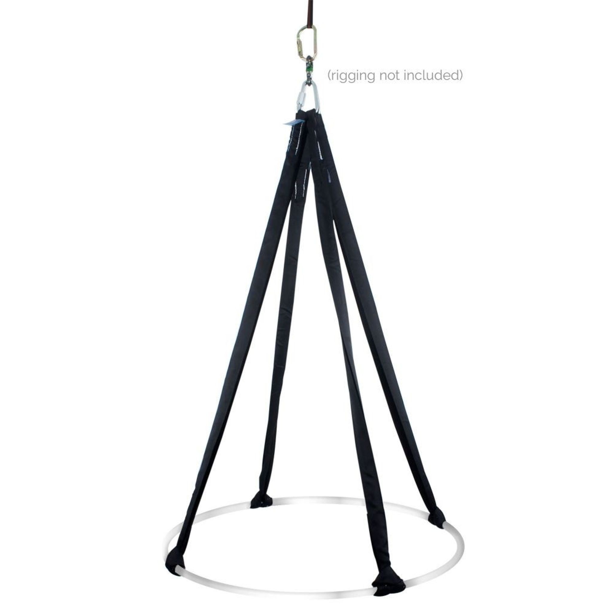 Tabless lyras are generally rigged using a polyester strop choked to the top of the hoop. A small piece of friction tape under the choke and loading can help keep the strop in place. If you want to make this aerial hoop rotate you can also add a high strength swivel at the top of your assembly.