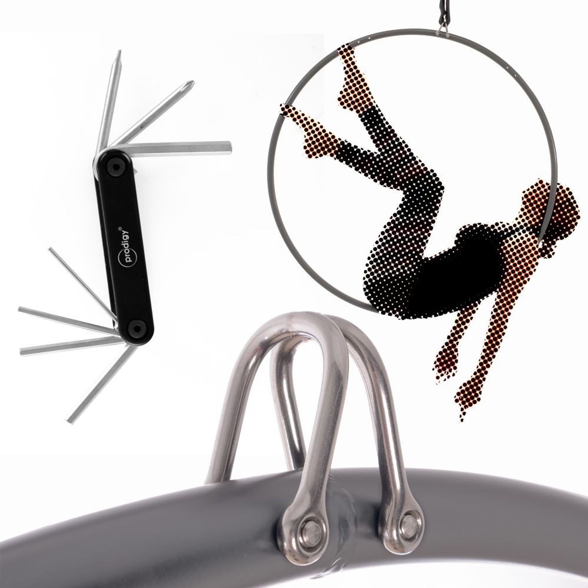 Using the provided multitool’s allen key, you can attach the shackles in any of 3 places. put both in the center pointing up for a 1 point hoop, put one either side point upwards for a classic 2-point lyra, or mix it up and add some extra shackles for a third central point, perfect for attaching a hand-loop strap to.