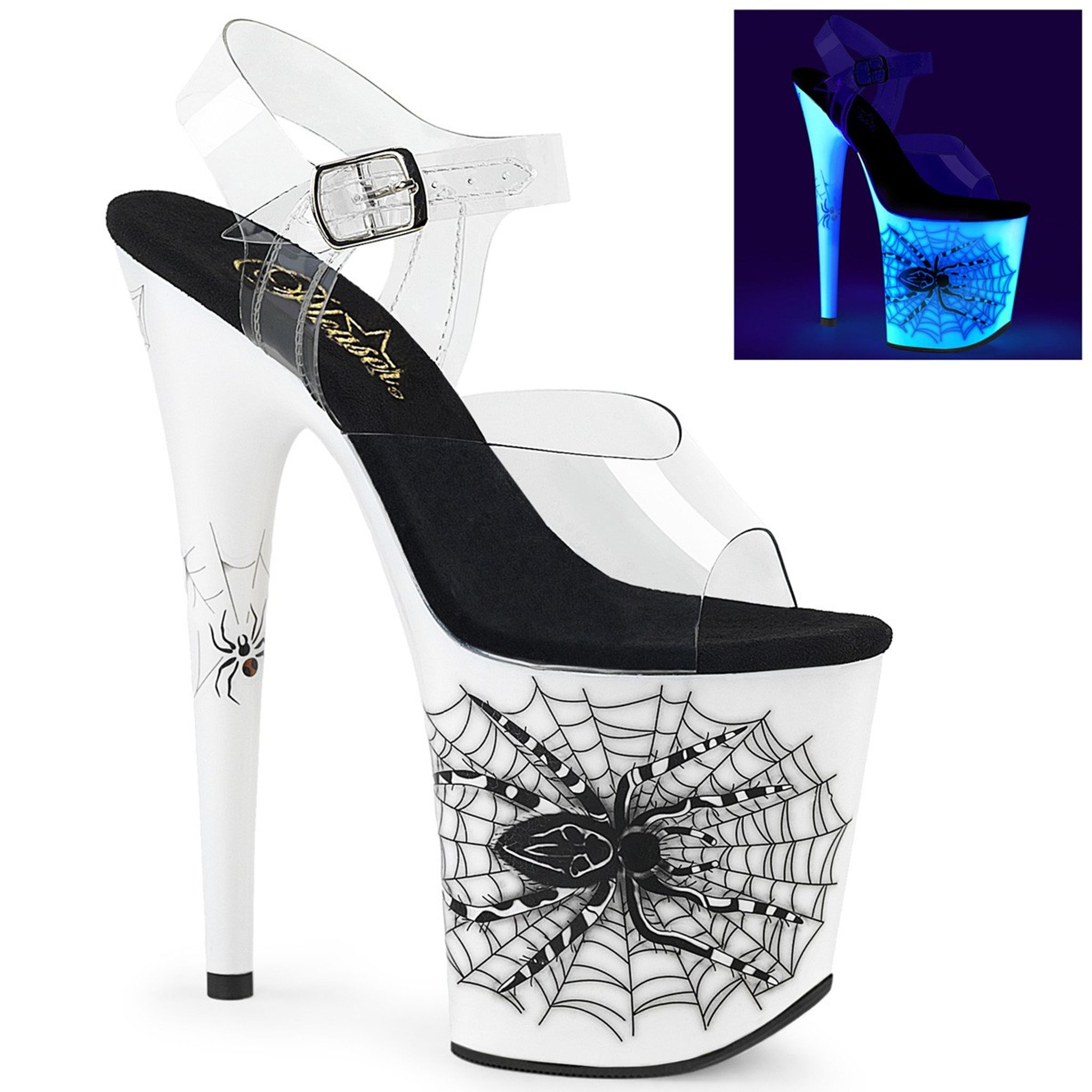 8" (200mm) Heel, 4" (100mm) Platform Ankle Strap Sandal Featuring Blacklight Reactive Spider Design on the Platform Bottom