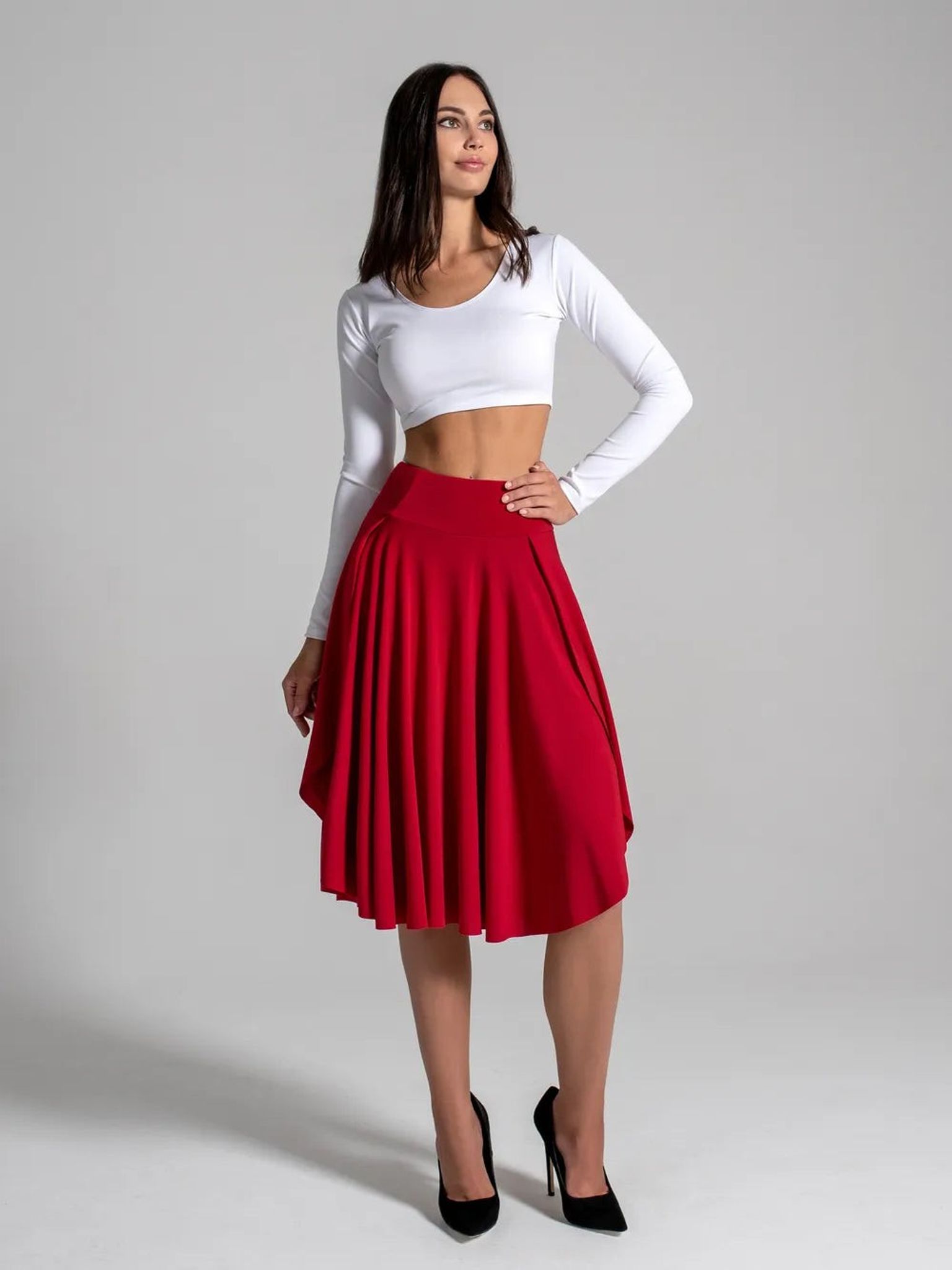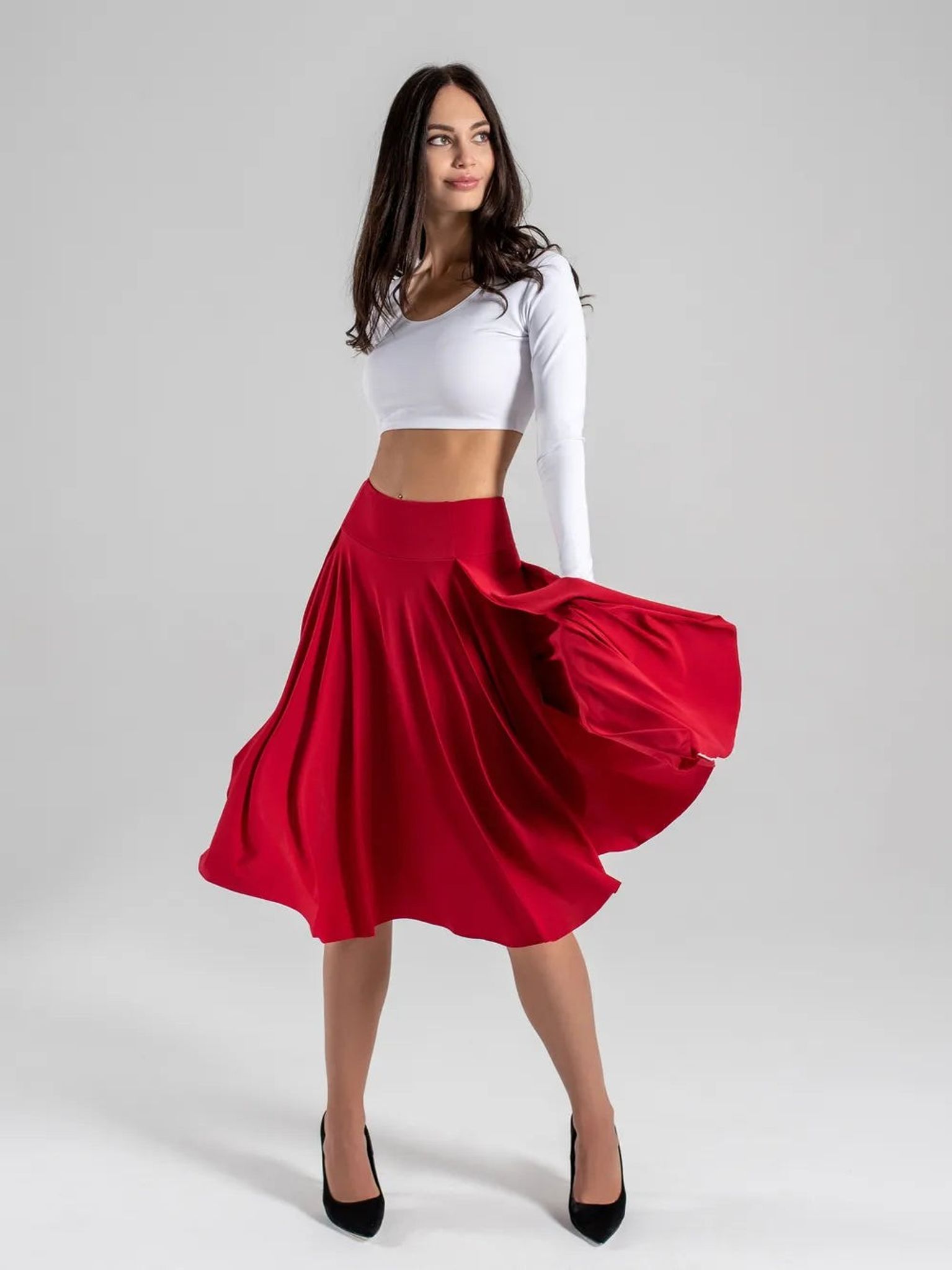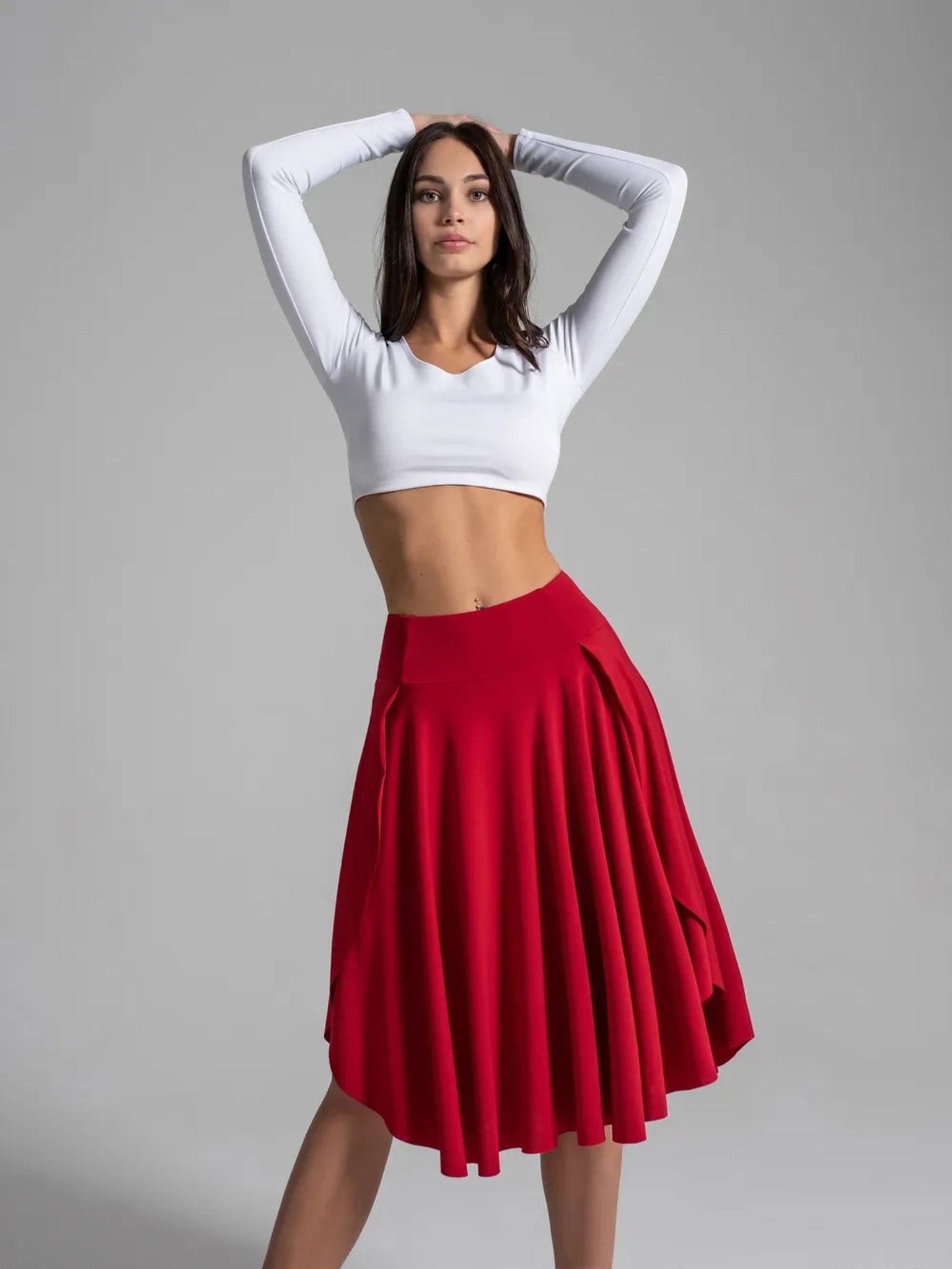 High-waisted sport skorts with waist compression for tennis, dances, pole dance, twerk. Elongated skirt and high-waisted sport shorts are made of dense premium quality Italian biflex. Broad double belt has 3 parts with stitched on structural lines providing perfect waist fit and belly and body sides tightening. Flatlock seams stretch together with the garment that perfectly fits your shape. Dolly skorts are really a multi-purpose high-quality clothing that will last a lifetime