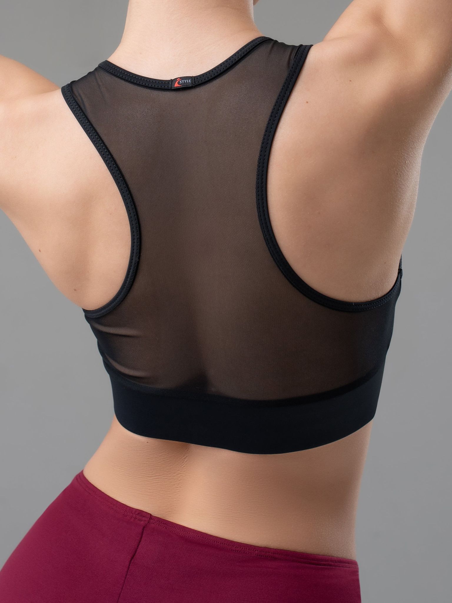 A universal sports top with chest support made of thick sports jersey and stretch knitted mesh.