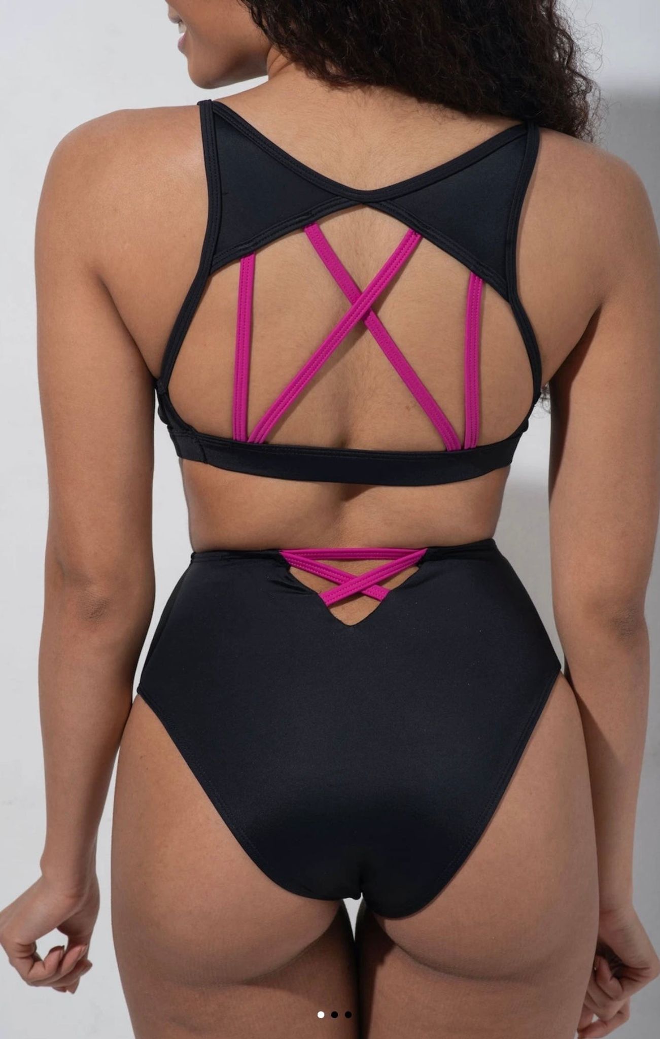 Fearless bottom comes in an all time classic black recycled lycra, it’s high-waisted and super comfy. From the front you think that is a standard black bottom, but wait until you see the back. It comes with a playful pattern, made from recycled magenta lycra and it is perfect for that extra oomph.