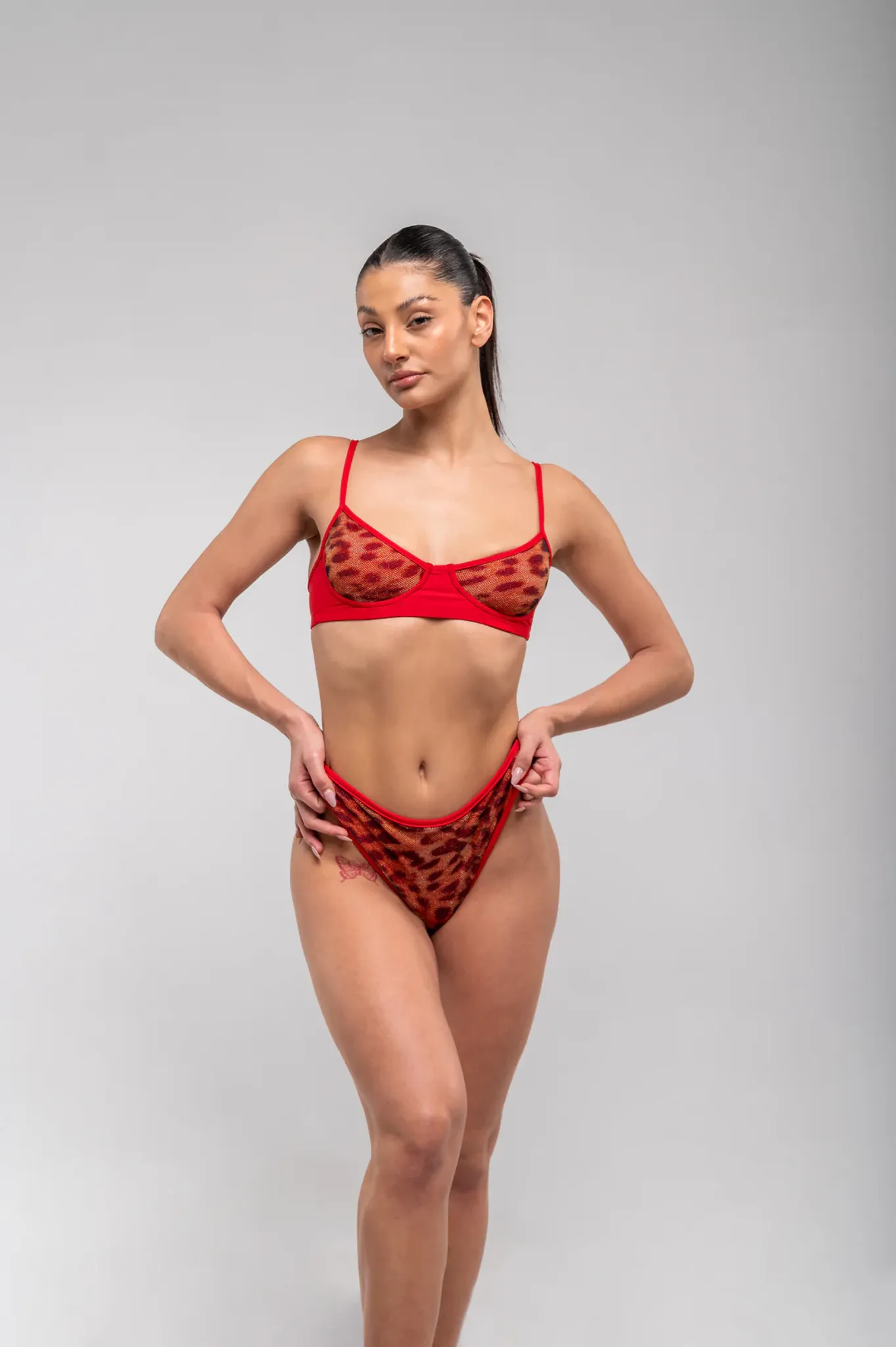 Irresistible, seductive, and flattering! The Inferno bottom has it all. Designed in a fiery red lycra with a sensational shimmery leopard mesh overlay. It is high-waisted, with satin details and a seamed bum for a more fitting look and cheeky coverage.