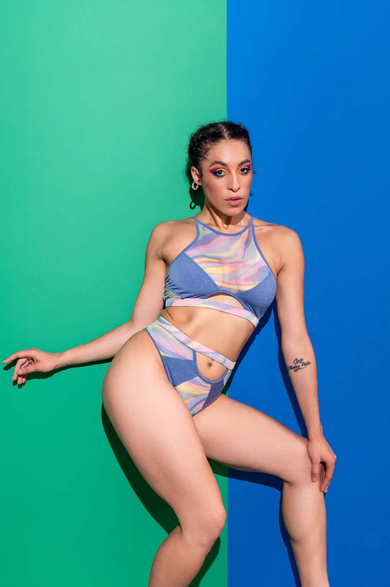 Your new go-to! The Lilly top is daring, glamorous and romantic. It comes in cornflower blue, glittery fabric, soft rainbow and delicate mesh. It features full back coverage with lined mesh overlay, so you can wear it on both sides, and a halter-like neckline.