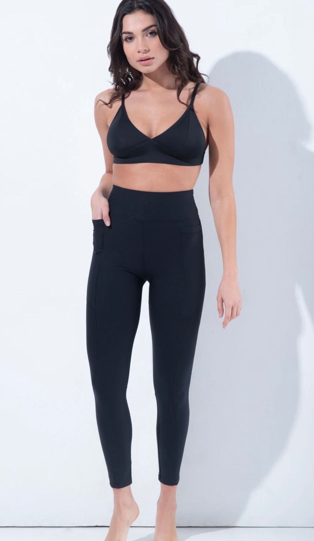 Super high-waisted leggings to keep your back protected, completed with a centre front vertical seam to lengthen your legs, top it with side pockets, YES, pockets!! You can fit all your essentials like your phone, keys, and credit cards. It is made from silky smooth black breathable textile. Take it from your practice to the shops to walks with your dog!
