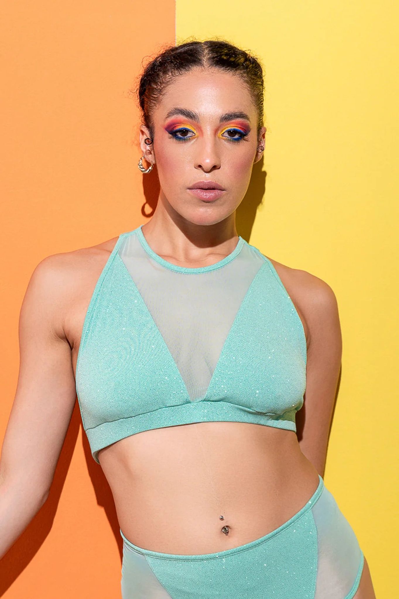 A Rad classic is back, better than ever! Say hello to the Triangle top, created in this fresh, glitter peach textile.If it is your goal to look sexy while training then this is for you. It perfectly combines the comfort of a sports bra when at the same time promises to leave no head unturned. With a strong V neck centre mesh front and thick over the shoulders straps for extra support.