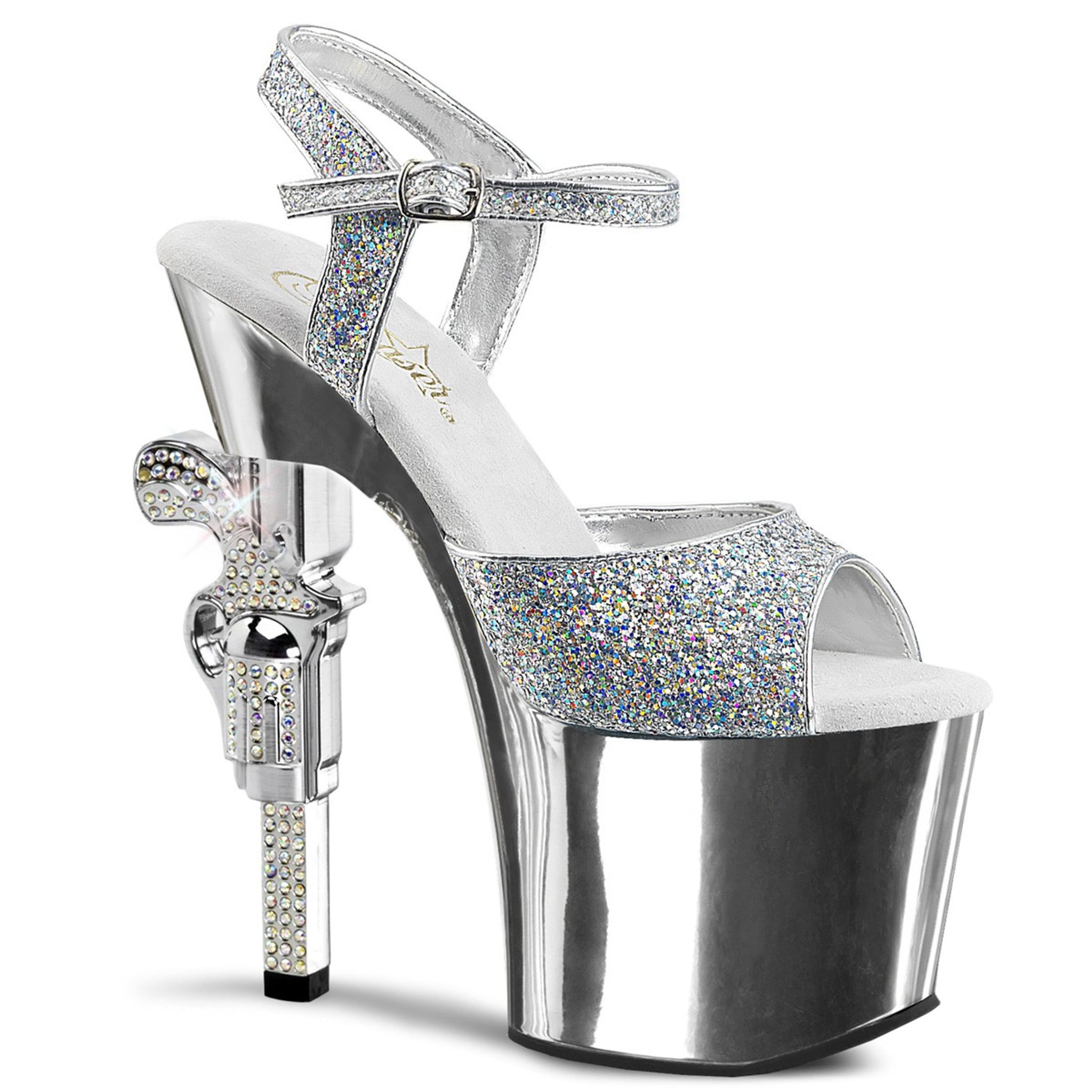 7" (17.8cm) Rhinestone Embellished Gun Heel, 3 1/4" (8.3cm) Platform Ankle Strap Sandal