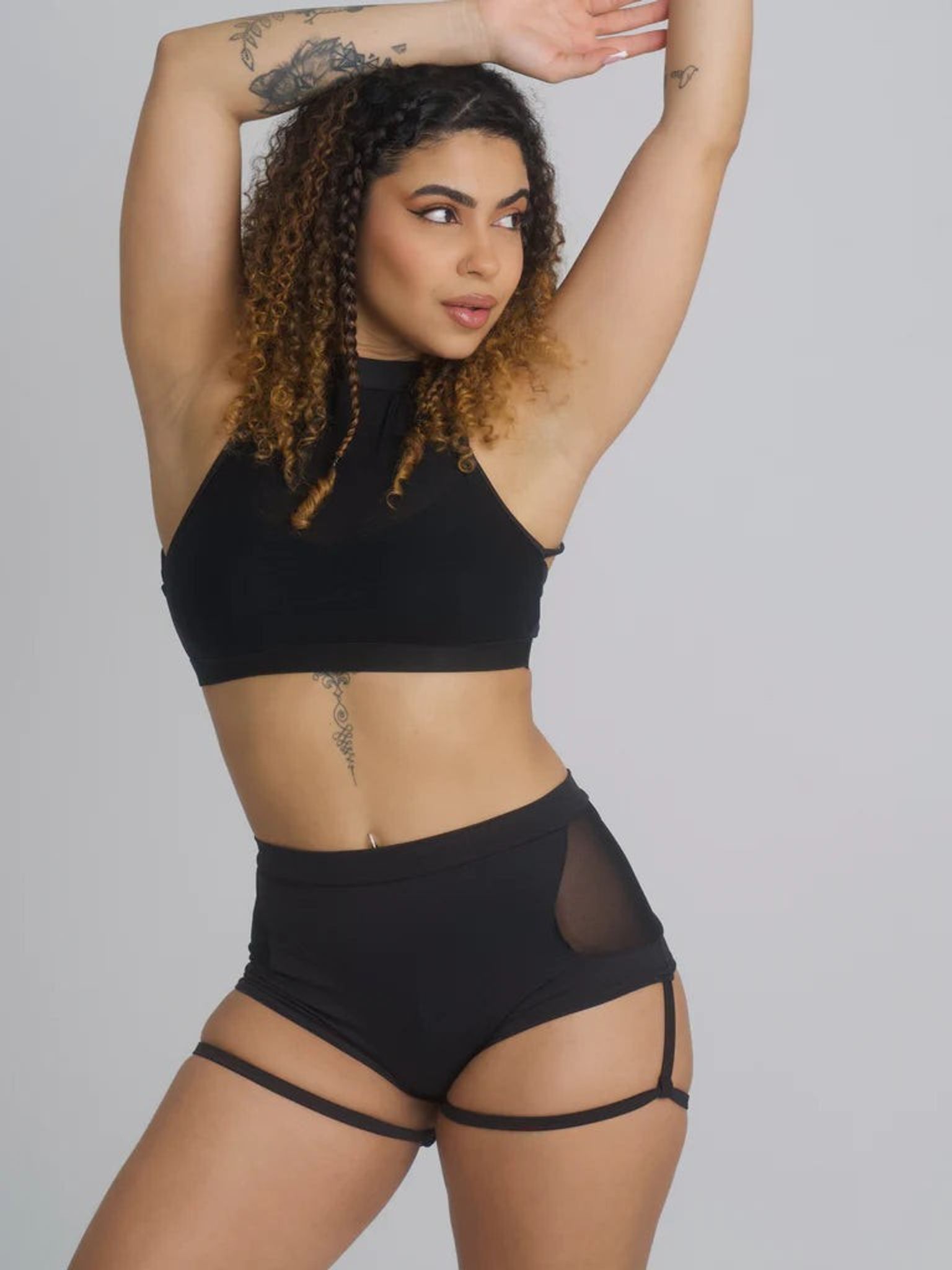 Sasha High Waist Shorts Black: Show off some skin with these garter-adorned, high-waist shorts - featuring a logo at the back and just a touch of see-through sass on the side. Get ready for your most stylish pole session ever!