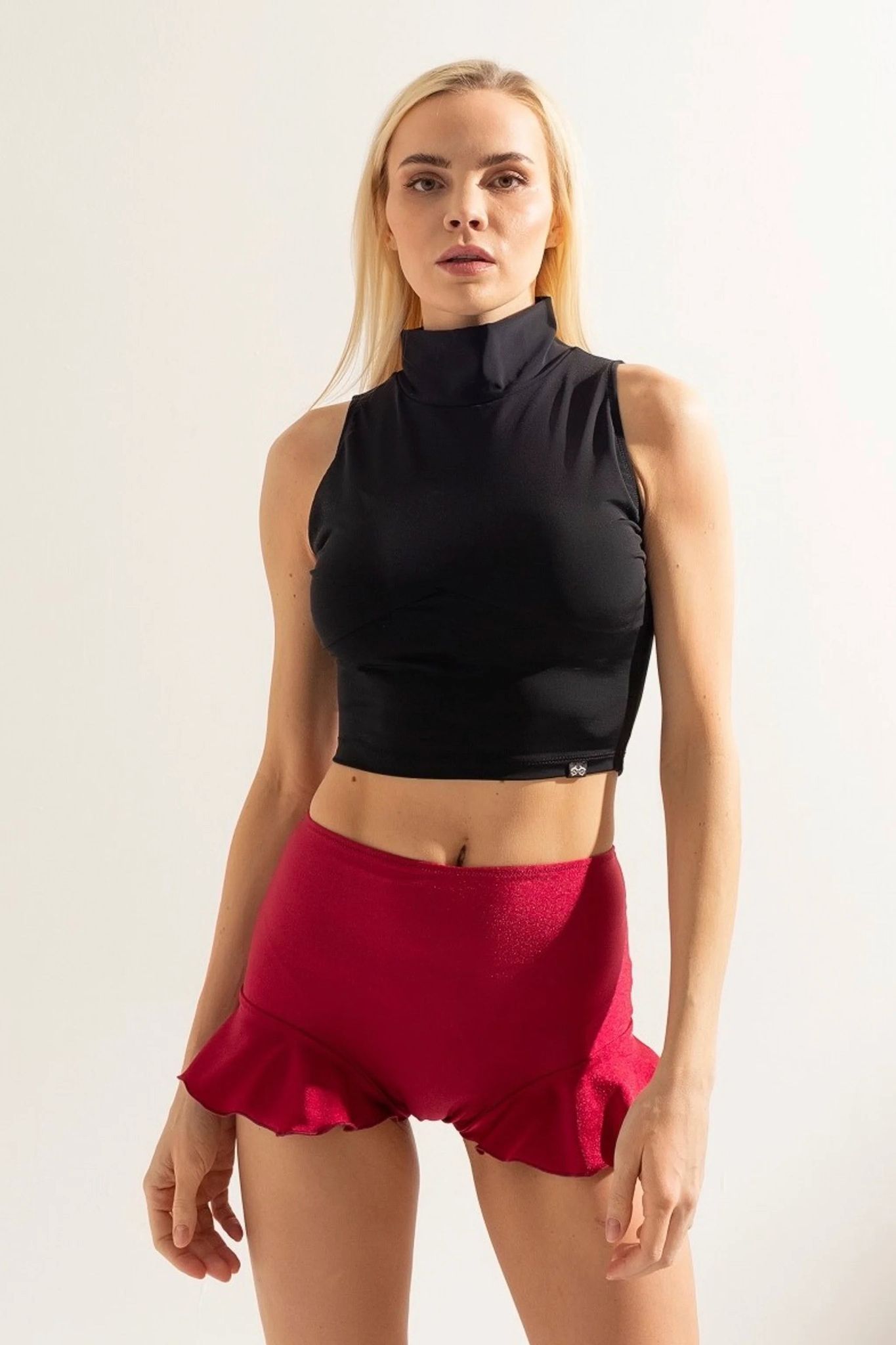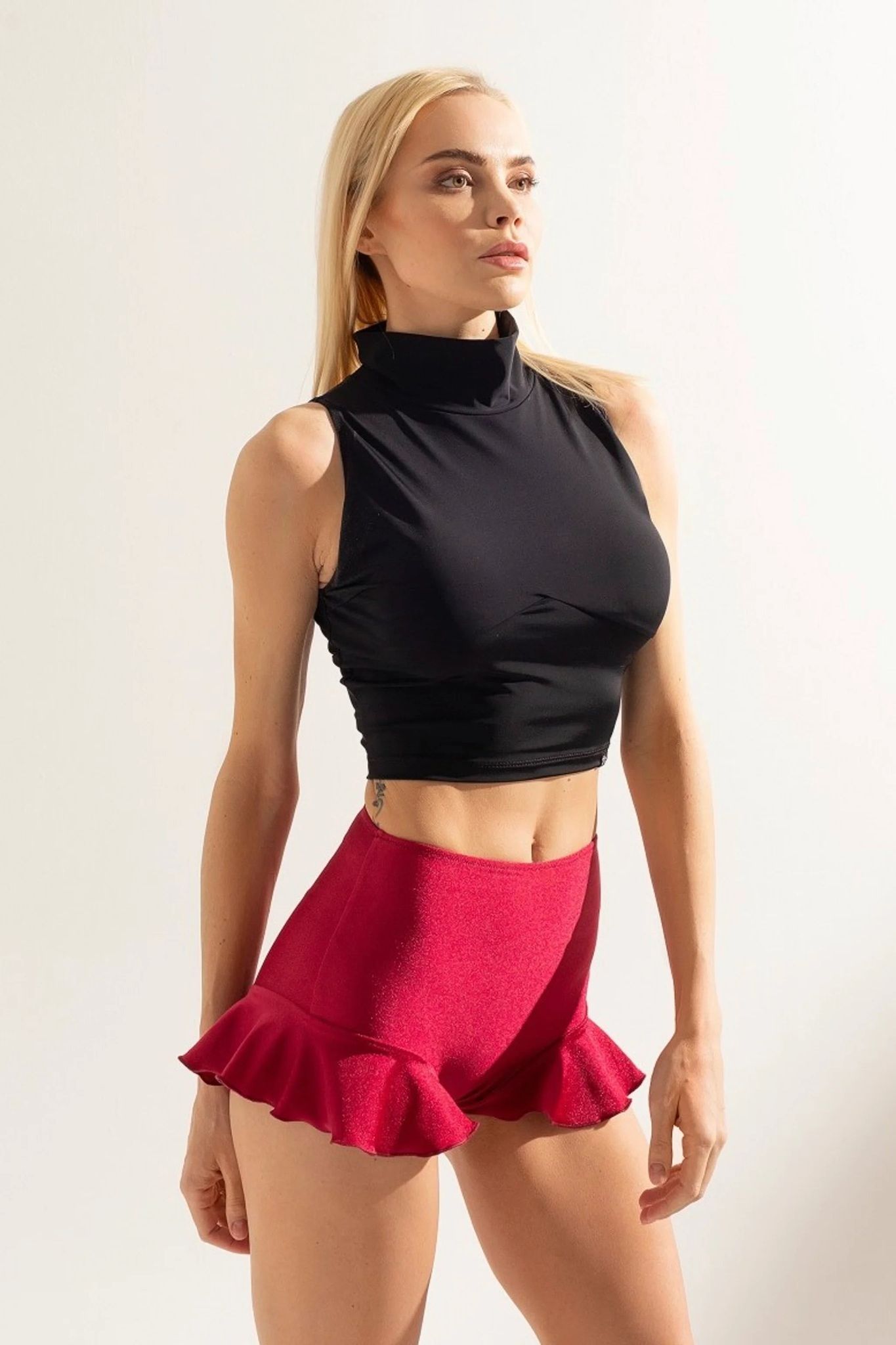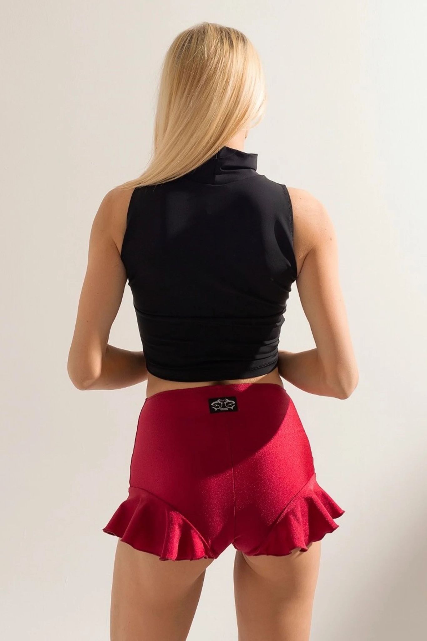 Discover elegance with Sharkpolewear's Sun High-Waisted Shorts. These chic shorts feature charming ruffles along the sides, adding a stylish flair to your pole dance or workout attire. Made from durable Italian biflex, they offer excellent buttock coverage and a flattering high-waisted fit. The material is pilling resistant and provides UV ray protection, making these shorts versatile for both pole practice and beach outings. Enjoy the comfort of a soft front lining.