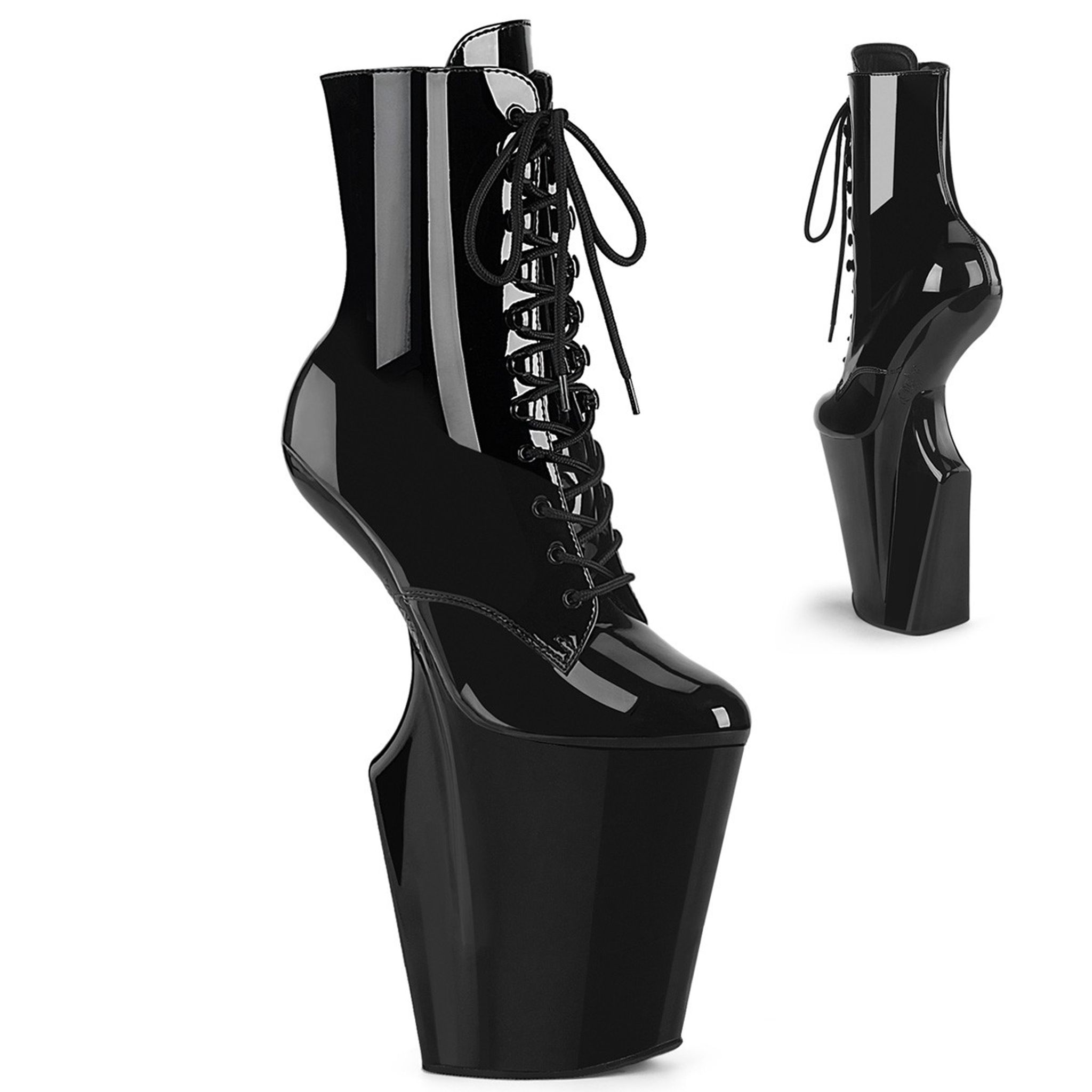 10" (254mm) Heelless, 4 3/4" (121mm) Platform Lace-Up Front Ankle Boot, Inner Side Zip Closure. **WARNING: Extreme Height & Heelless Design. Not Recommended for Walking or Dancing.